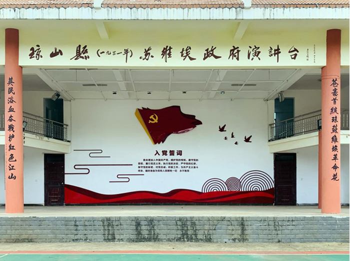 瓊山縣蘇維埃政府演講台位於基地的西南側,演講台背景為中國共產黨黨旗,以紅色元素為主題,用於開展黨員干部主題演講、重溫入黨誓詞等黨性教育活動場所以及相關紅色文藝教育會場﹔紅色革命文化展館位於基地的東南側,內部以“紅色”元素+黨建文化為主題,詳細展示了中國共產黨黨史、海南解放歷史、蒼英村蘇維埃革命斗爭史、革命先烈、黨員先進典型等,以革命老區的資源優勢,營造了濃郁的紅色革命氛圍,充分展示紅色革命精神和時代精神,提供了一個教育引導廣大黨員進一步增強黨性觀念,踐行黨的宗旨,學習革命先烈英勇事跡、聆聽清廉故事,感受清風正氣,以崇高信念淨化思想、以革命精神洗滌靈魂、以先進事跡激發干勁。