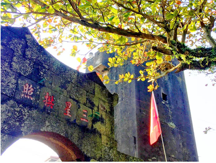 三卿村最顯眼的,莫過於矗立在村口的碉堡樓,樓體上爬滿了歲月的痕跡。石樓的正面鑲著一塊石匾,匾上銘刻“安華樓”三個大楷字。這座始建於民國的石樓由火山石干壘而成,被認為是三卿村的標志性建筑。牆體上清晰可見的彈孔痕跡彰顯著它曾在當地抵御日軍侵略時做出了不小貢獻。