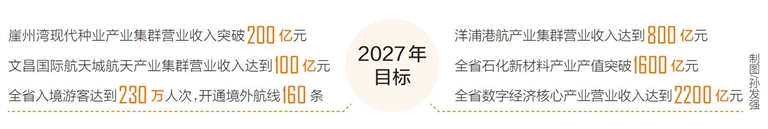 優勢產業提升行動也將同步推進。力爭到2027年,全省入境游客達到230萬人次,開通境外航線160條﹔洋浦港航產業集群營業收入達到800億元,全省集裝箱吞吐量達600萬標箱,穩定運行集裝箱班輪航線85條﹔醫療旅游人數突破150萬人次﹔全省石化新材料產業產值突破1600億元﹔全省數字經濟核心產業營業收入達到2200億元。
