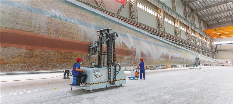 近日,在東方市臨港產業園的東方明陽新能源高端裝備產業基地生產車間,工人正在海上風電葉片下作業。海南日報全媒體記者 袁琛攝