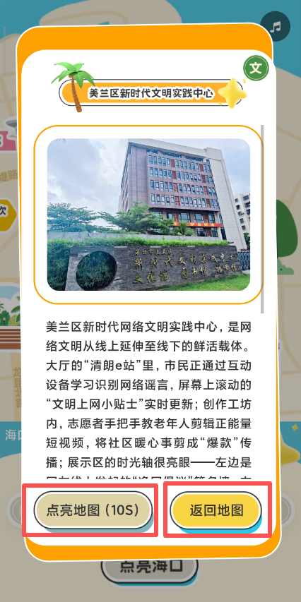 4、點擊橙色地標后,可閱讀地標介紹,當閱讀計時結束,即可點擊“點亮地圖”按鍵,隨即返回首頁。