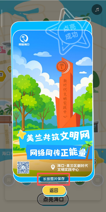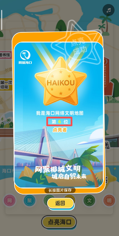 7、“網聚椰城文明”六個文字標識全部被點亮,即可“點亮海口”,系統將生成一份專屬電子徽章海報。