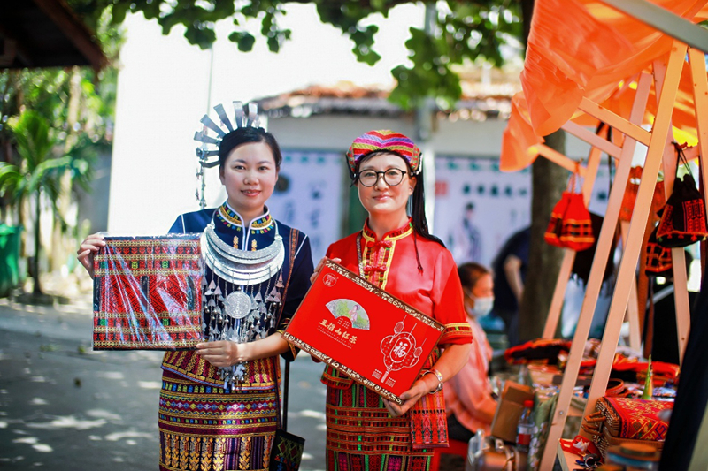 愛心助農銷售與文創產品展示環節同樣熱鬧。民俗特色產品展架上,來自番陽鎮手藝人制作的黎錦、苗繡、手工包等非遺文創做工精美,包裝山蘭糯米酒、魚茶、虎乳靈芝、椰殼制品等特色產品琳琅滿目,推介員耐心講解每款產品的工藝與文化內涵,吸引不少游客駐足選購。