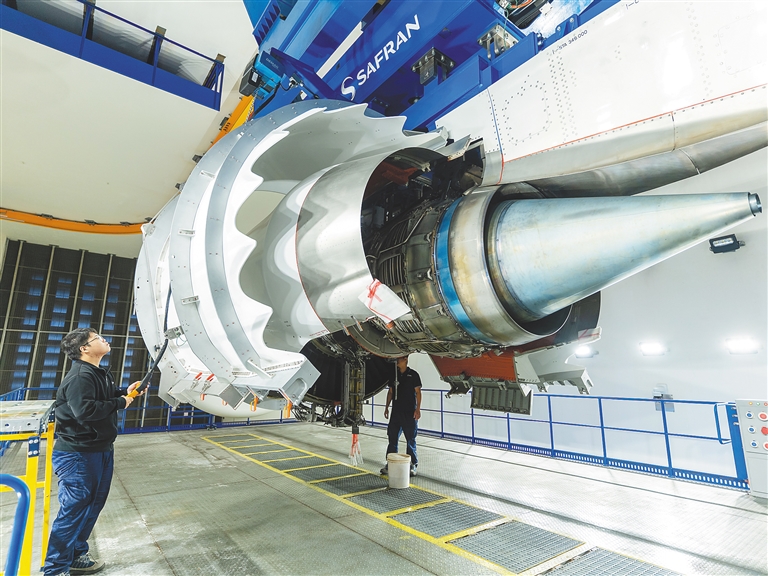 近日,在海口美蘭空港吉耐斯航空發動機維修工程有限公司發動機試車台,工作人員在作業。該試車台能夠承載15萬磅級發動機推力測試,是目前國內最大的發動機試車台,能夠滿足全球主流航空發動機機型的測試要求。據統計,今年前十月,海口空港綜合保稅區保稅維修貨值達478.6億元,同比增長71.8%。
