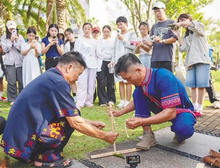 非遺傳承人向海南大學學生展示鑽木取火技藝。海南日報全媒體記者 李天平攝