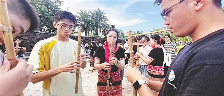 非遺傳承人教大學生吹灼巴。海南日報全媒體記者 黃婷攝