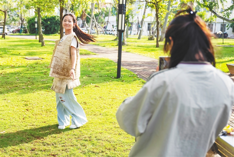 大學生試穿樹皮衣。海南日報全媒體記者 李天平攝