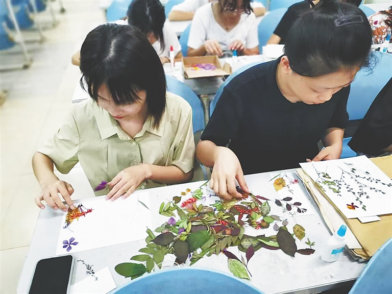 “壓花(又稱押花)藝術巧妙融合了植物學、美學與手工技藝,把大自然的絢爛瞬間定格,賦予植物新的生命與藝術價值,2014年被列入廣東省惠州市第六批市級非物質文化遺產名錄。”日前,在瓊台師范學院瓊先樓514教室裡,該校理學院公共課教學部主任、植物與非遺省級科普基地負責人朱為菊帶領學生開啟一場植物壓花之旅。學生們將經過脫水、保色、壓制處理的樹葉與花瓣細心拼貼、精心構圖,最后再進行壓制定型。在他們手中,平凡的植物材料“變身”為栩栩如生的藝術作品﹔稍作修飾,又化身為精美的壓花扇子、壓花台燈。這一刻,非遺不再遙遠,它就在高校學子的指尖綻放。