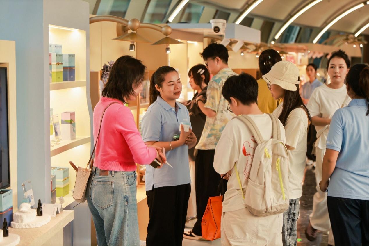 據介紹,“游禮文化海南禮物”在三亞國際免稅城BC空中連廊,以“七十米長廊”為載體,打造兼具視覺與趣味性的“文化策展+場景零售”空間,打破傳統零售布局。游客穿行其中,既可接觸如“嘀嗒果”“斑斕司”等明星食品,也能體驗獨屬於海南,來自北緯18°度的“堯香堂”椰油護膚品。長廊通過空間敘事,將商品轉化為文化媒介,實現“海南故事”的可視化、可觸化傳播,是“免稅+文旅”融合在場景維度的一次重要突破。