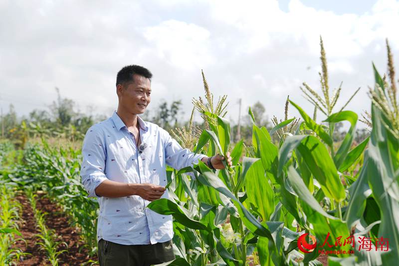 佔達程觀察玉米的生長情況。人民網記者 符武平攝