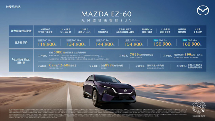 9月27日,长安马自达首款全球战略级新能源 SUV-MAZDA EZ-60(下称“EZ-60”)在海南区域正式上市,新车推出纯电、增程两大动力版本共6款车型,官方指导价11.99万元-16.09万元。截至10月31日,购买EZ-60 MAX 版的消费者可享价值5000元高阶配置二选一:无论是搭配255/40 R21米其林竞驰4 SUV轮胎的21英寸深凹花瓣轮毂,还是兼具科技感与实用性的高清AI电子外后视镜+流媒体内后视镜,均能满足不同用户的个性化需求;而Pro版用户则可免费升级23扬声器豪华音响系统,主副驾头枕扬声器加持下的杜比全景声与HiFi原声效果,打造移动影音座舱。此外,金融礼支持0首付起、12-60期超低息方案(年均费率低至1.99%),极大降低购车门槛;补能礼赠送适配海南户外露营、环岛自驾的充/放电枪;无忧礼提供全城免费上门取送车及服务延时补贴,从购车到用车全周期守护用户体验。