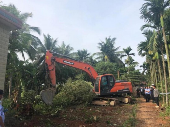 4月16日,万宁市多部门联合依法对槟榔城项目规划六路选址地块范围内种植的树木、苗木等进行清表。市委常委、副市长王三防现场指挥清表工作。