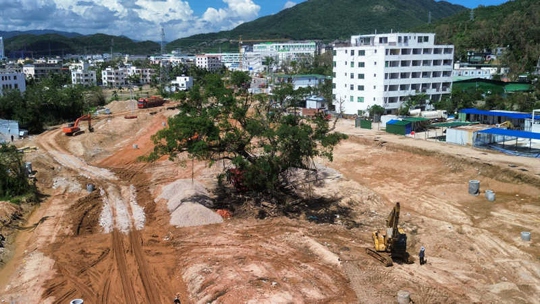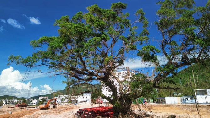 海罗片区荔枝沟出口路段百年榕树施工现场。实习生王忠华摄